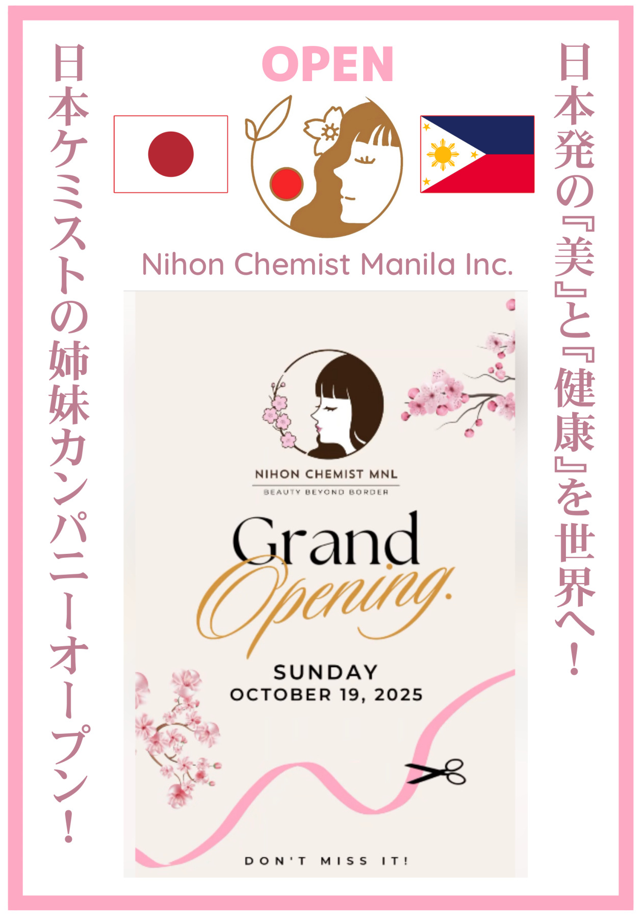 『Nihon Chemist Manila Inc.』 OPEN! 『Nihon Chemist Manila Inc.』がオープンしました 日本ケミストが日本発の「美」と「健康」を世界へお届けする拠点がアジア初オープン! グローバルな視点でアジアへの進出を展開していきます 広く皆様のお役に立てるよう、ご愛顧を賜りますようお願い申し上げます